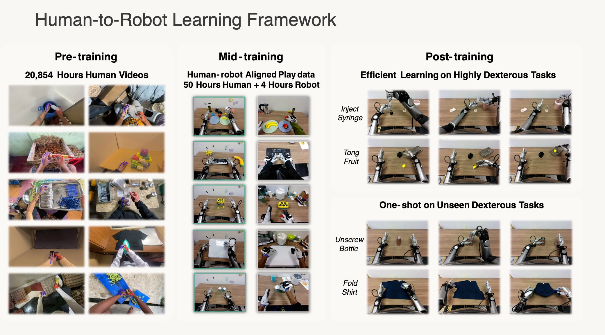 Use egocentric human video plus wrist and hand motion as a scalable supervision signal to pretrain a VLA. Then use a small amount of aligned human–robot data plus robot data to make it work on real dexterous manipulation.