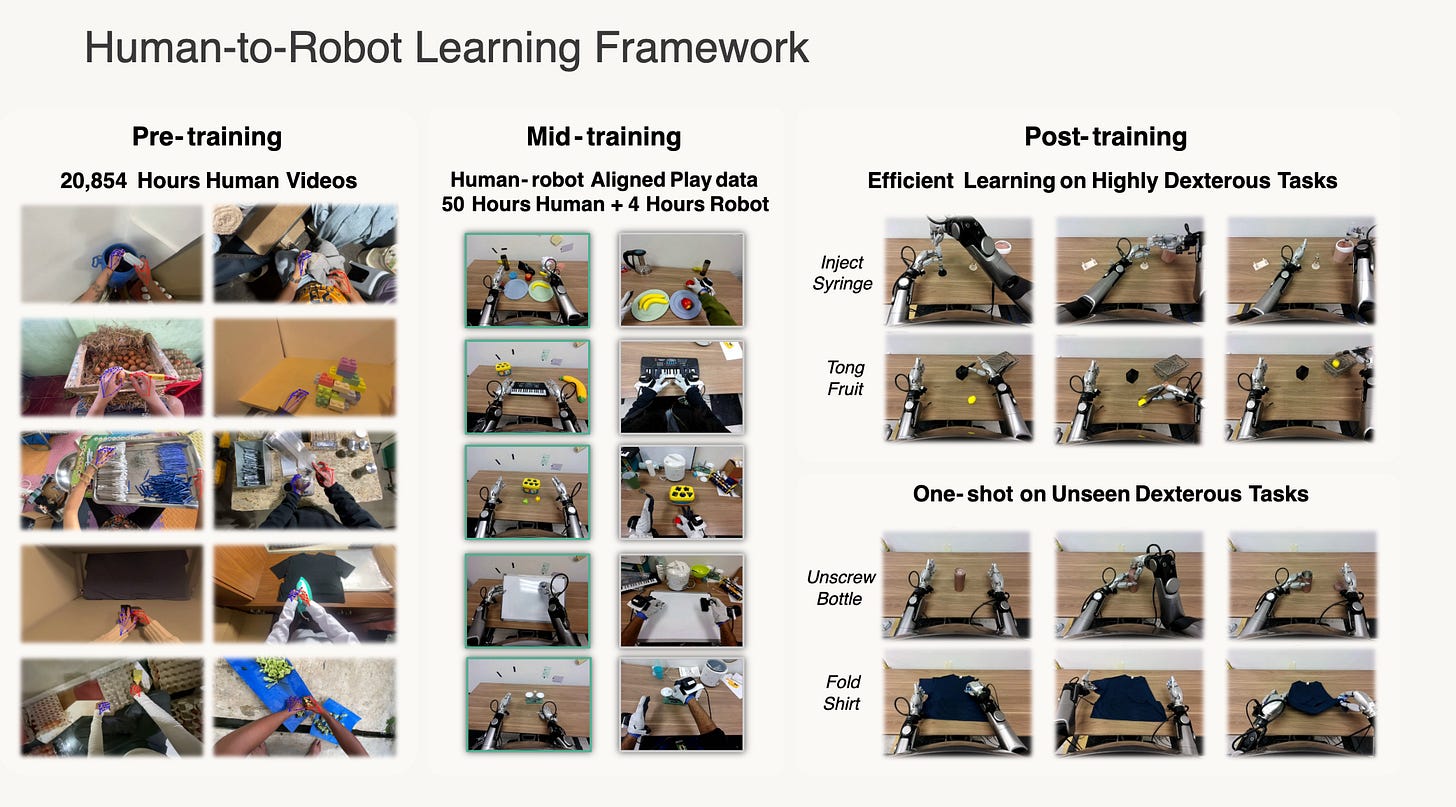 This paper argues that dexterous manipulation can be pretrained from large-scale human data first, then aligned and improved with a much smaller amount of robot data.